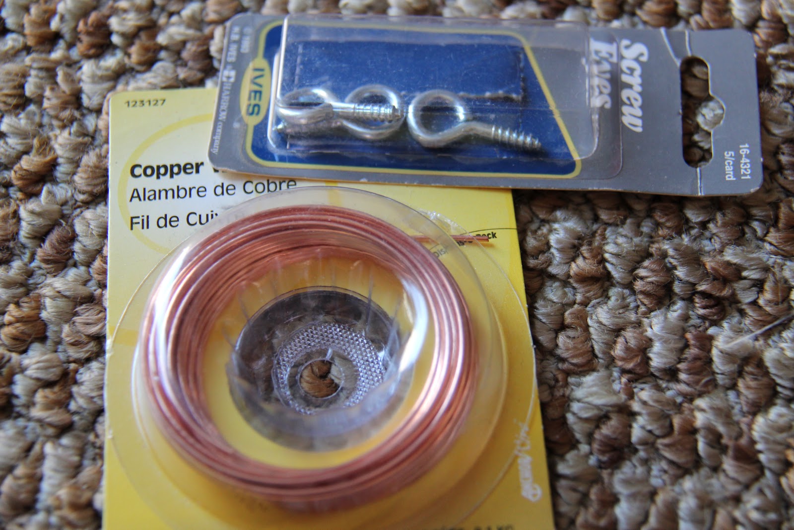 Other supplies included eye screws and wire for hanging. Nothing matches, but that's OK because it's what I had on hand, but also the mis-match goes well with the shabby-chic feel.